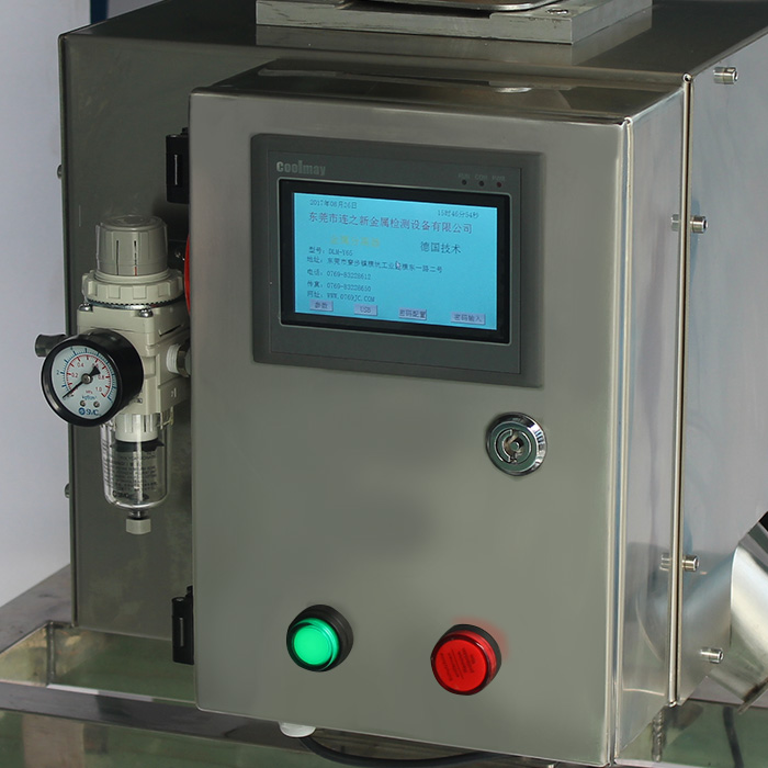 原料从料斗或送料器自由下落进入金属分离器,如果没有金属杂质,原料会直接通过金属分离器流向下端的出料口。如果检测器检测到原料中含有金属,那么控制器立刻启动分离板将金属物和部分原料一起导向侧面的排料口,然后分流板迅速恢复至正常的位置,分流板速度可调,金属分离器的检测精度也可根据生产需要调节,最小可检测并分离出Φ 0.2mm的金属颗粒。